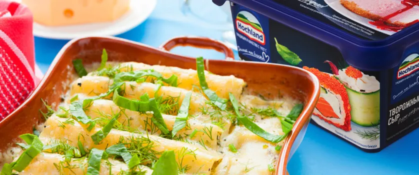 Каннеллони вынуть из духовки, залить сливочным соусом и закрыть снова фольгой. Поставить в духовку еще на 15 мин.