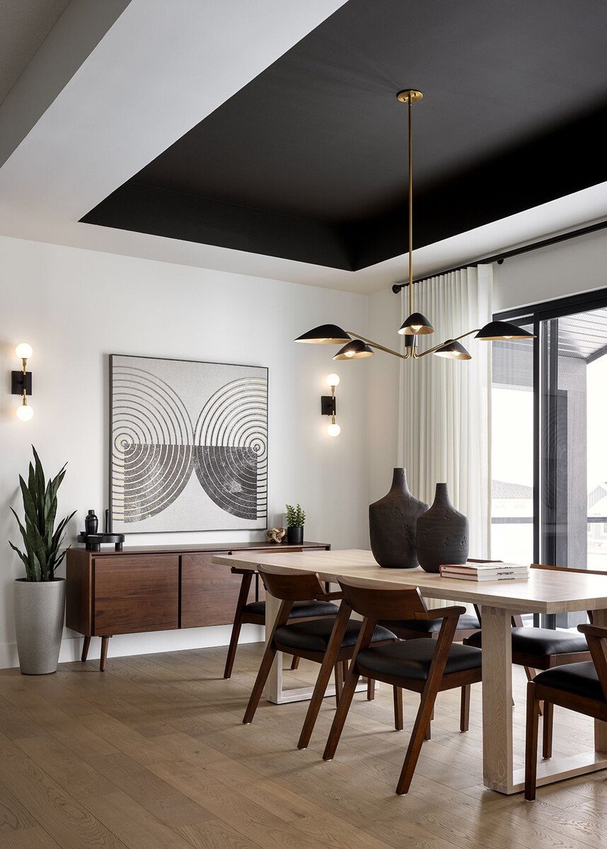 Долгое время белый потолок считался единственно правильным решением — он визуально увеличивает высоту помещения и делает его светлее. Однако современные дизайнеры все чаще используют темные оттенки для потолков: графитовый, темно-синий, даже черный.