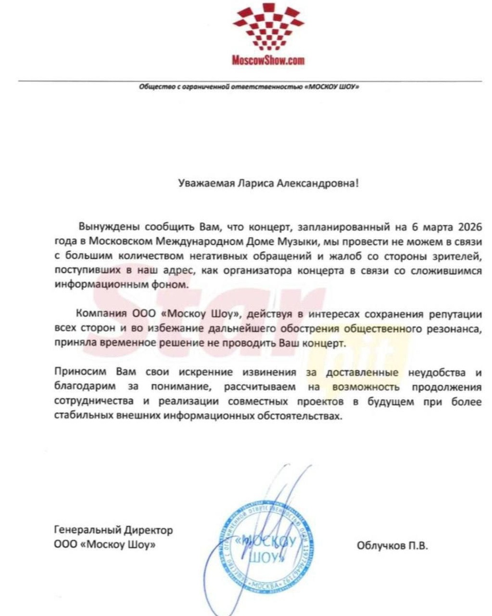 Это произошло после того, как отменили юбилейный концерт певицы, запланированный на 6 марта. Организаторов буквально закидали жалобами в адрес Долиной которая обвалила рынок жилья в России. Теперь народ будет развлекать Петр Дранга. Тем временем директор Долиной продолжает твердить, что большой концерт состоится. Уважаемый, загляните в документ: черным по белому вас известили об отмене. Тут и печать имеется