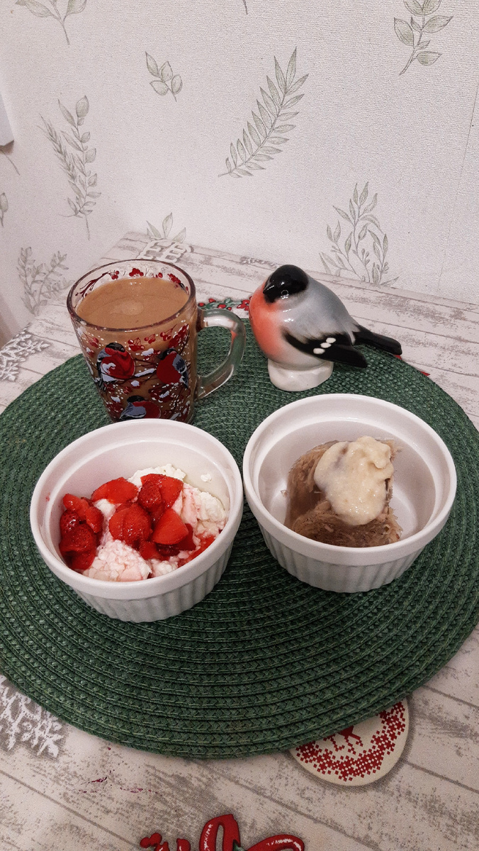 Завтрак: творог с клубникой, холодец Premit, кофе с молоком. 293 ккал