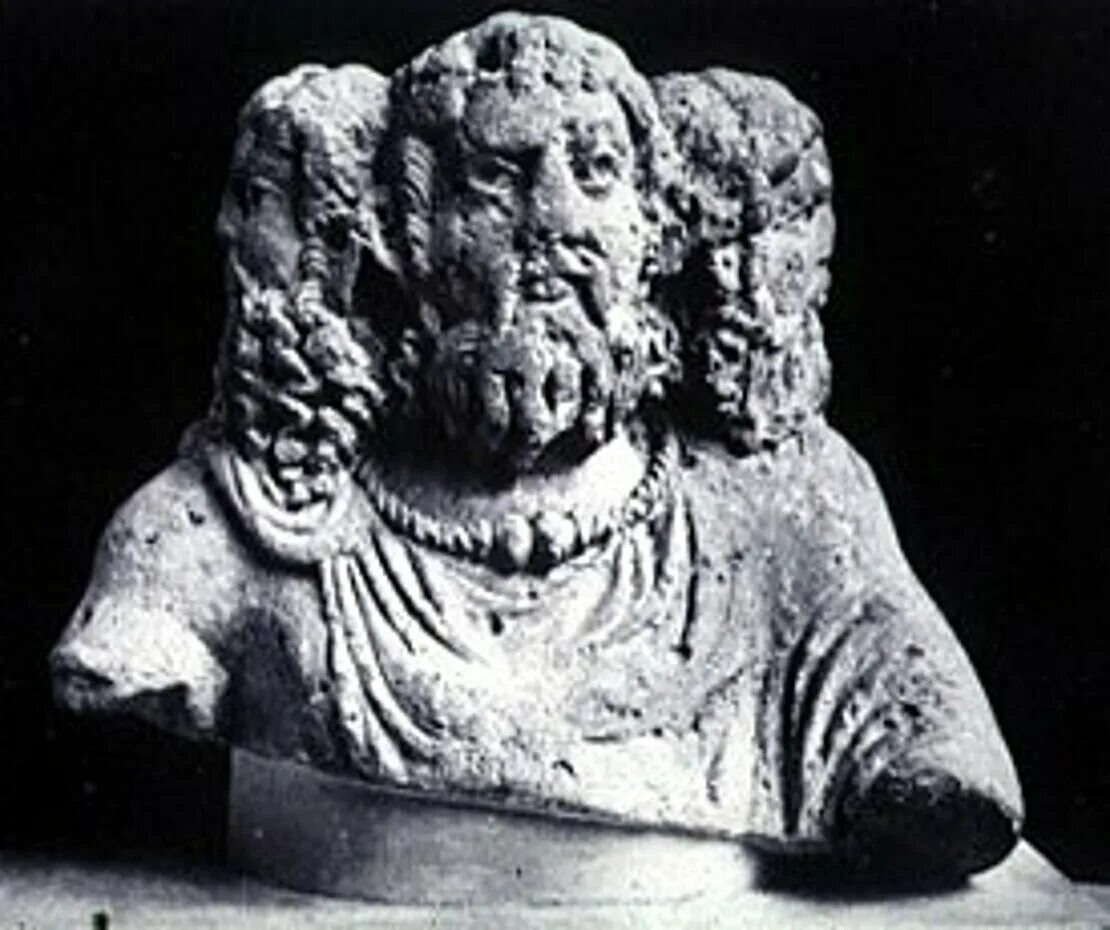 Скульптура представляет собой трикефала — трехголовое существо.
