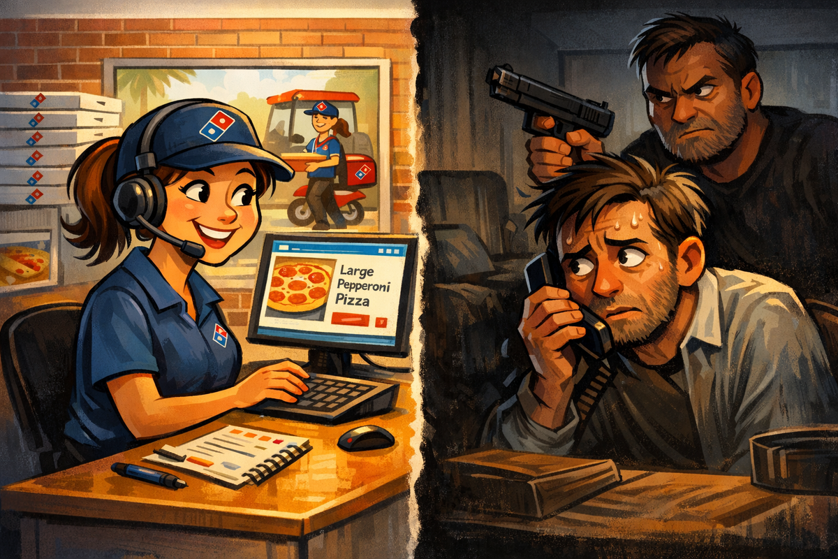 Телефонный звонок в пиццерию — это обычно история про выбор между тонким тестом и пышным краем, про вечный спор о допустимости ананасов и количество сыра. Но иногда на том конце провода не просто голодный человек, решающий гастрономические дилеммы, а тот, кто пытается спасти собственную жизнь, используя меню как шифровальную книгу.