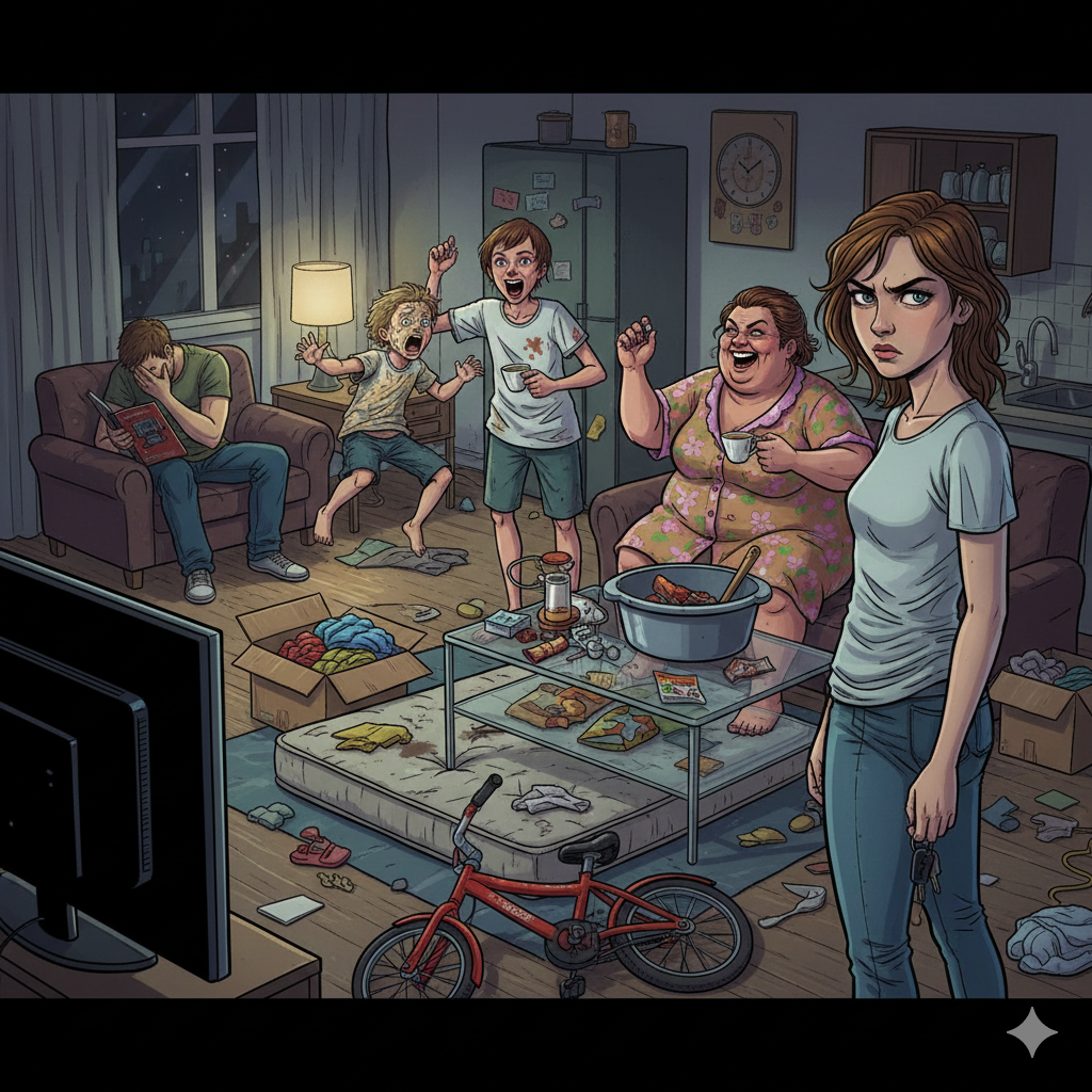 - Алло, Лен? Привет. Прости, что поздно. Помнишь, ты говорила, что у тебя есть знакомый риелтор, который сдает комнаты? Нет, не мне. Мне нужно сдать долю в квартире. Срочно. И желательно кому-нибудь… очень шумному. Байкеру? Отлично. Или студенту с барабанной установкой. Да. Завтра утром буду.
