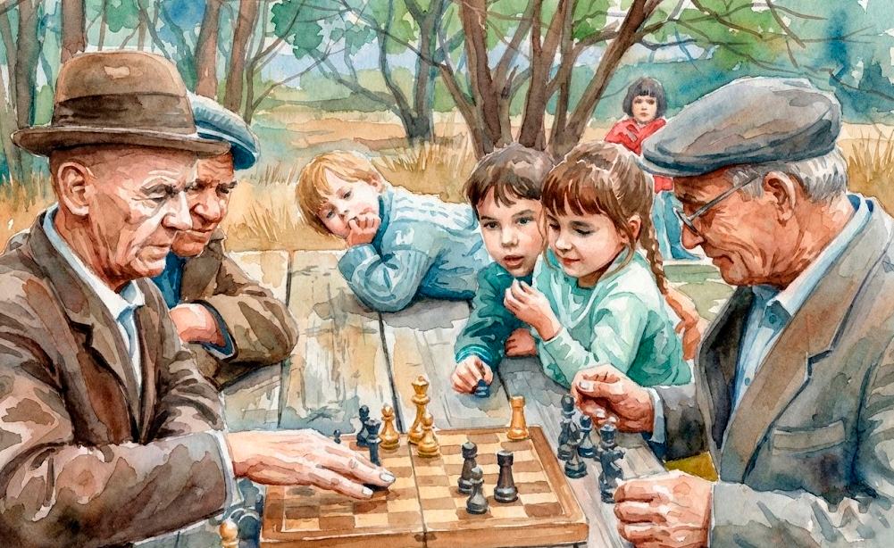 Помните компании дедов на парковых скамейках? У меня такое ощущение, что они сидели там всегда, неважно, стояла на улице жара или лил дождь, и даже когда мокрый снег лупил по шахматным доскам. Мне тогда казалось, что их ничто не берёт. И мы с пацанами бегали мимо, а они даже головы не поднимали, у дедов шла битва! Дело было не в шахматах, только теперь я это понимаю. Точнее, не только в них. Это был целый ритуал, своя жизнь, свой клуб под открытым небом. Вступительных взносов тогда не было никаких, расписания не составлялись. Просто приходишь, садишься и ждёшь партнёра. Или стоишь за спиной и подсказываешь. За что, между прочим, можно было огрести от обоих сразу. В нашем парке культуры были специальные тяжёлые столики, с нарисованными клетками прямо на столешнице. Краска постоянно облезала, и каждую весну какой-нибудь активист из пенсионеров сам их подновлял. Фигуры приносили свои. У одного деда был комплект из деревянных, тяжёлых, ещё довоенных вроде. Он их в холщовом мешочке носил
