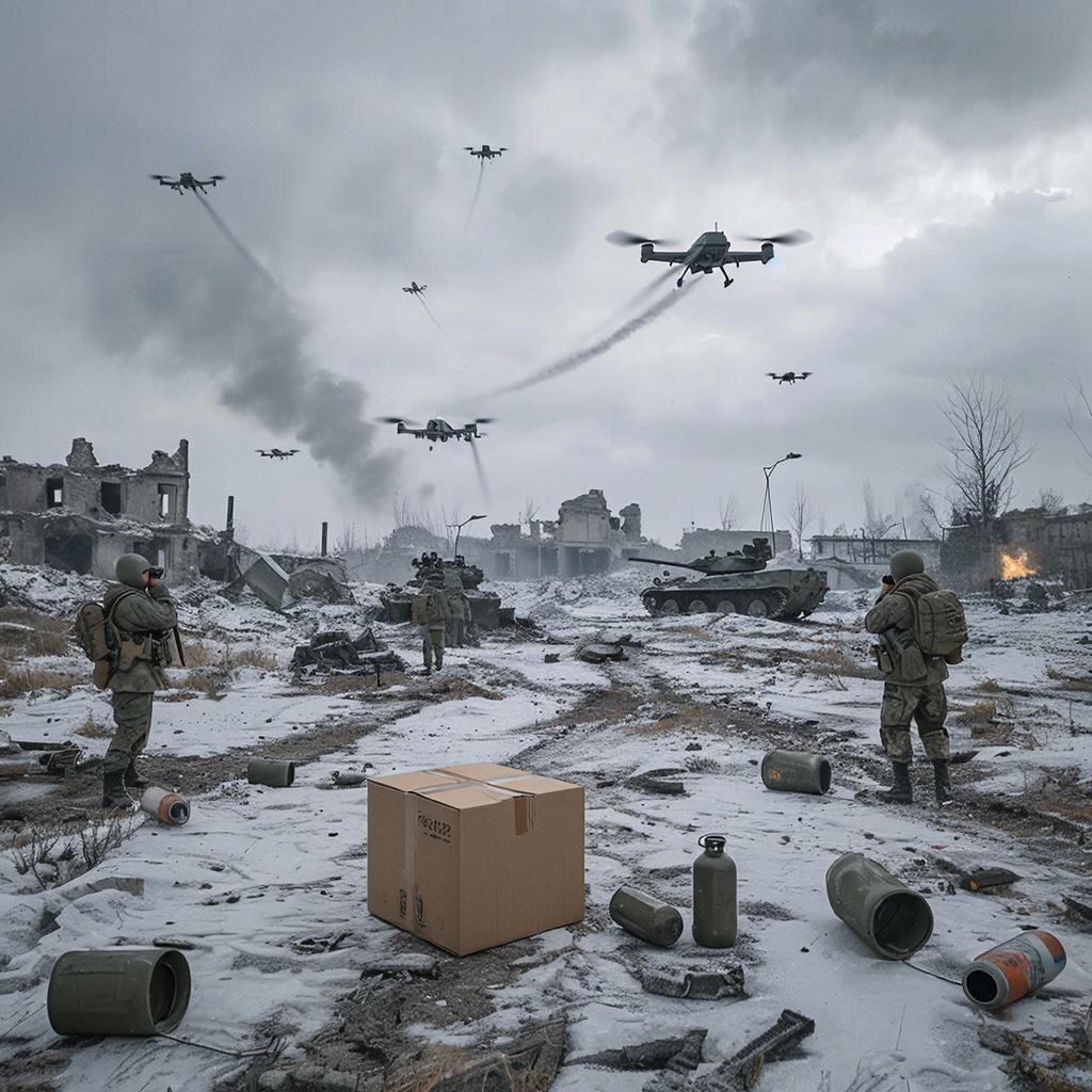 Несколько дней у нас валялась коробка. Обычная коробка средних размеров. В суматохе закинули её на ПВД при частичной разгрузке машины, прибывшей из зелёной зоны перед Новым годом, и благополучно забыли. Перетащили на свои места только воду и топливо. Как-то не до неё было. Боевая обстановка требовала особого внимания. По поступившим сведениям, на нашем направлении к противнику прибыло пополнение, да ещё какие-то заграничные спецы из Франции – расчёт БПЛА. Жгли технику, охотились за личным составом, отрабатывали по антеннам на развалинах домов и тепловым сигнатурам. Дроны летели друг за другом круглосуточно, падали в результате разряда батарей, подавления средствами РЭБ, поражения стрелковым оружием и ПВО, но продолжали свою смертоносную работу. Вот в таких условиях перед Новым годом мы выполнили боевую задачу и, вернувшись на ПВД, сопроводили по радиосвязи экипаж, привозивший к нам в красную зону груз и личный состав. А в это время в тылу, наверное, шел снег. Тот самый, пушистый и чист