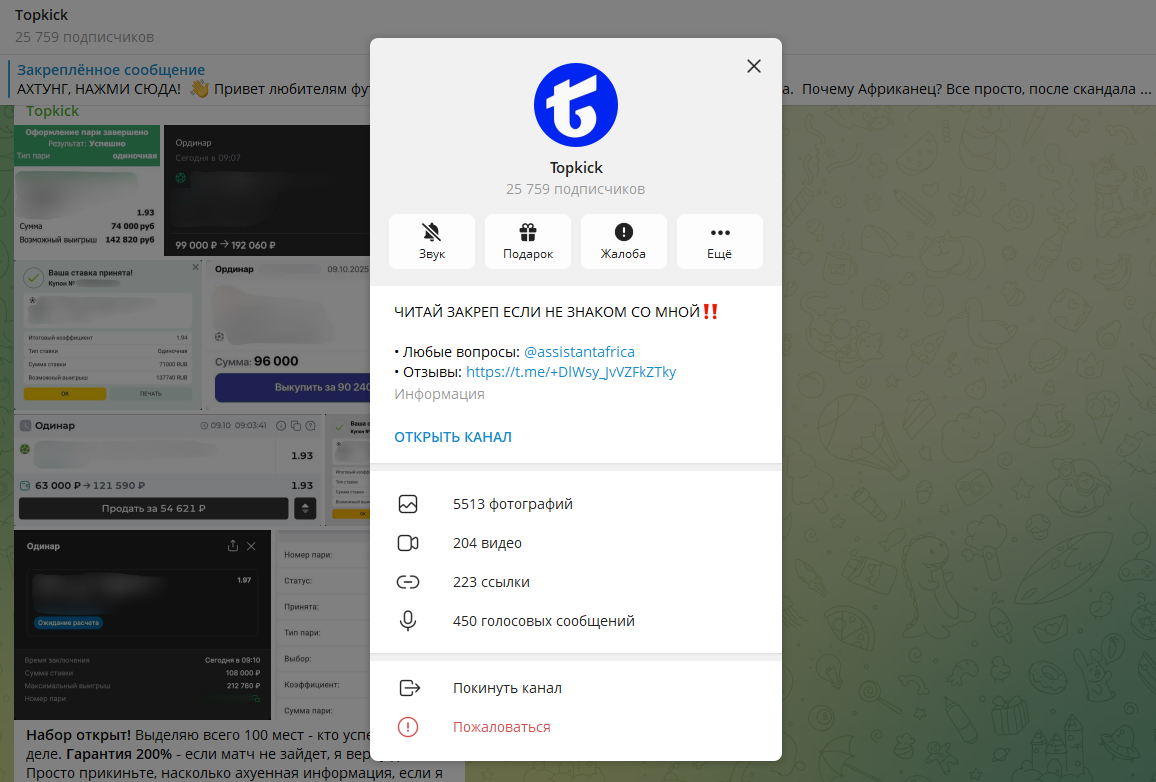 Проект Topkick активно продвигается как «инновационный сервис для ставок», который якобы предоставляет эксклюзивные инсайды, недоступные обычным бетторам. Автор уверяет, что его методика даёт почти стопроцентную проходимость и позволяет зарабатывать стабильно и без риска. Однако при детальной проверке выясняется важный момент: Topkick — это очередной проект каппера-мошенника по кличке Африканец, хорошо известного в беттинге. За ним тянется целая сеть однотипных каналов, которые он годами запускает, закрывает и перезапускает под новыми названиями, уходя от негативных отзывов и жалоб. По сути, перед нами не новый сервис, а очередная копия старой схемы. ✅ А вот проверенный способ заработка. Topkick появился относительно недавно и сразу начал агрессивное продвижение. Подписчиков у канала много, но вовлечённость минимальная: комментарии закрыты, обсуждений нет, реакции слабые. Это типичная картина для проектов с накрученной аудиторией. Важно отметить, что Topkick — не единичный канал, а ча