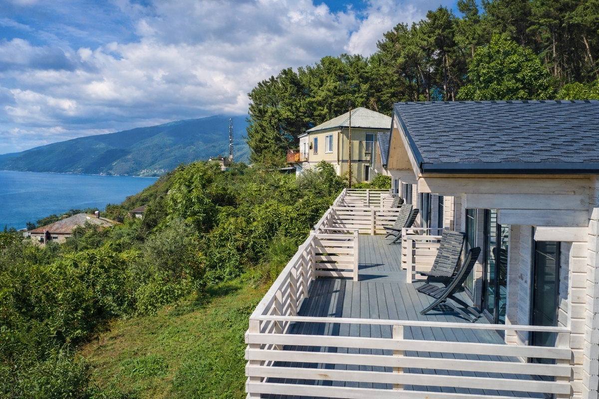 Домики видовые "Крылья" 😍 Каталог отелей в Telegram 🔶 Каталог Вконтакте 🔶 Сайт АБХАЗБЕРЕГ 📍 Абхазия, Гагра, ул. Сосновая, 28 🏖 15 минут до пляжа 👥 вместимость 3-4 человека ✔️ДОМИКИ: Новые деревянные эко-дома с потрясающим видом на море! Два домика трёхместных, два четырёхместных. Изолированные друг от друга домики находятся у подножья гор. У каждого своя большая веранда с креслами. Стильный интерьер, с душой продуманные детали: светильники, зеркала, шторы, бокалы, полотенца. Всё качественное и новое. ВСЕ домики двухкомнатные. В одной комнате двуспальная кровать, в другой либо односпальная/либо двухъярусная. Кондиционер, Wi-Fi интернет, холодильник, посуда. ✔️ТЕРРИТОРИЯ: Собственная кухня-терраса на территории. Много места вокруг, газончик. Мангальная зона. Очень тихо, потрясающие ароматы природы. С одной стороны вид на горы, лес, с другой стороны море, рассветы и закаты. Самые крутые фото для соцсетей можно сделать прямо на собственной веранде. Пляж Гагрский в 10-15 минутах. Важ