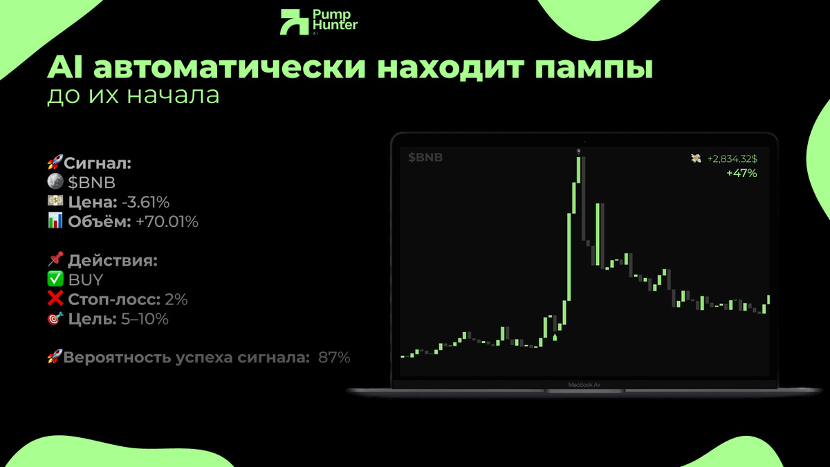 Именно таким инструментом является PumpHunter AI — телеграм-бот, который отслеживает крипто-пампы 24/7 и присылает сигналы сразу, как только появляется возможность заработать.