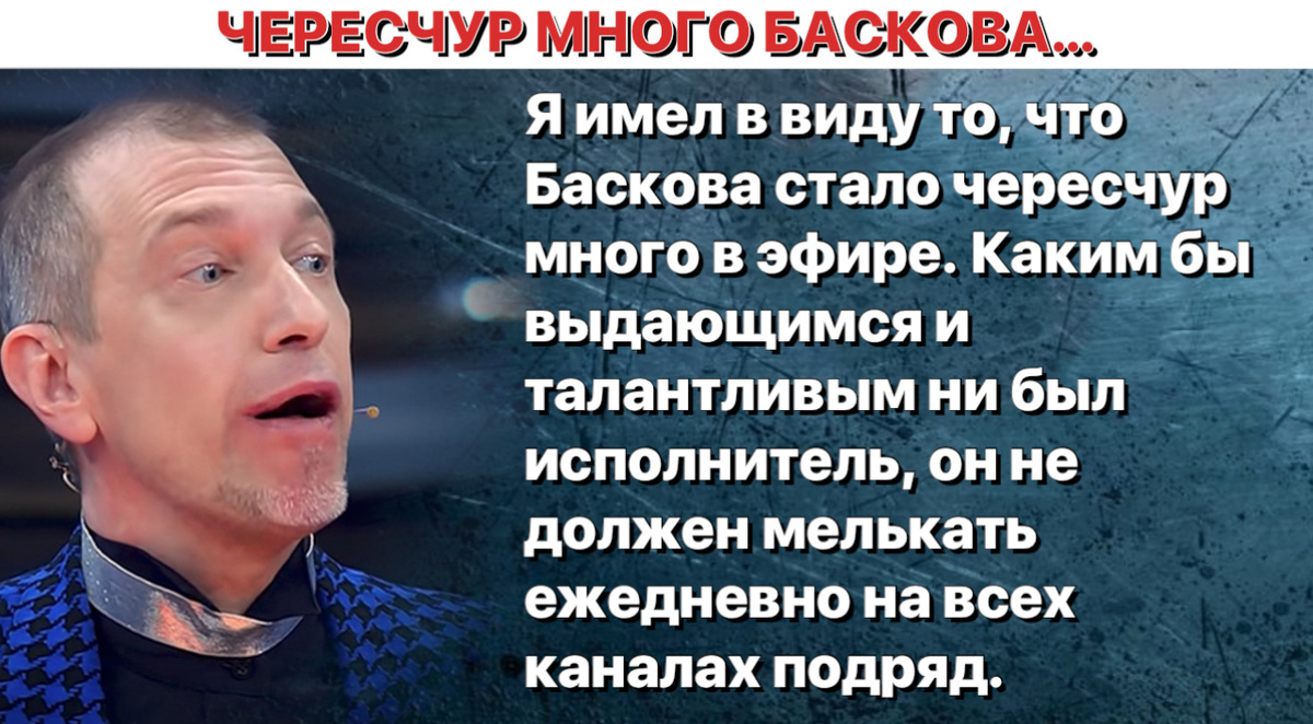 Сергей Соседов вновь резко и прямолинейно высказался об "акулах" нашего шоу-бизнеса. В недавнем интервью Соседов пояснил ранее сказанное про Николая Баскова, отметив, что он ни в коем случае не хотел травить артиста, а лишь говорил о том, что его стало слишком много в нашем медиа-пространстве. И как тут можно не согласиться с Соседовым? Сергей высказал мысль о том, что чрезмерное присутствие одного артиста на телеэкранах вызывает у зрителей психологическое перенасыщение. По его мнению, даже обладатель выдающихся вокальных данных не должен постоянно появляться в эфире в разных амплуа - будь то роль ведущего, исполнителя, члена жюри или приглашённого гостя. Критик подчёркивает: бесконечная медийная повторяемость неизбежно снижает интерес публики, независимо от уровня таланта и популярности артиста. Соседов проводит параллель между нынешним положением дел и эпохой классической эстрады, к которой принадлежит, в частности, Николай Басков. Артист воспитывался на традициях таких легенд, как Л