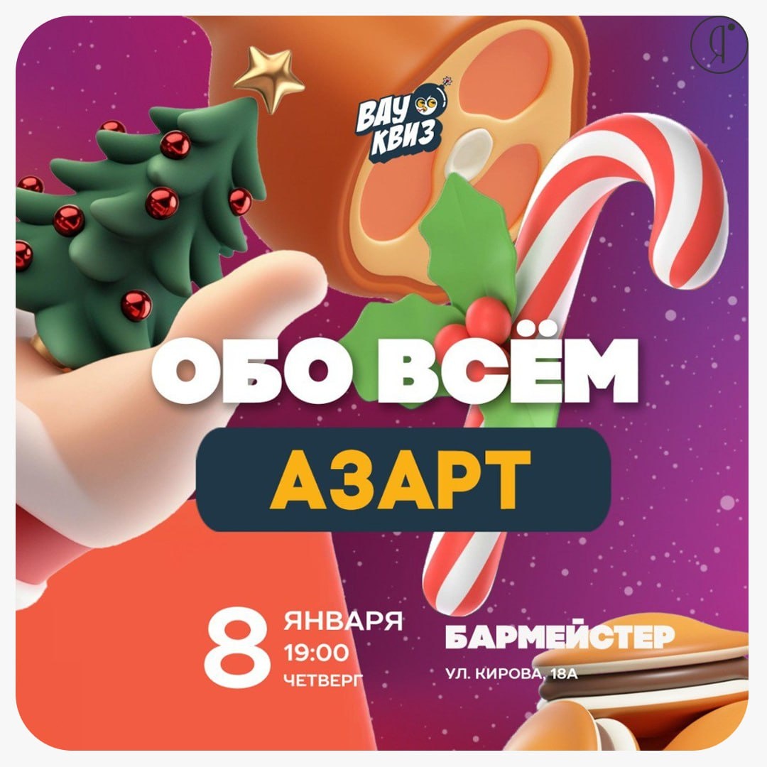 Азарт» #Квизы #Вечером Азартный командный квиз с повышенными ставками Возвращается формат викторины, где цена ошибки крайне высока — каждый неверный ответ может существенно повлиять на итоговый результат команды. Игра построена на принципах стратегического риска и проверки командной сплоченности. Программа начинается с серии простых вопросов для разминки, после чего тематика резко расширяется, охватывая такие разные области, как биология, кулинария, танцевальное искусство и авиация. В рамках игры предусмотрены раунды в формате бинго, а финальная часть потребует от участников принятия сложных стратегических решений. 8 января | 19:00 Barmeister, Кирова, 18а 600 руб. +79142700028 Online Якутия | Ждем вас в МАХ