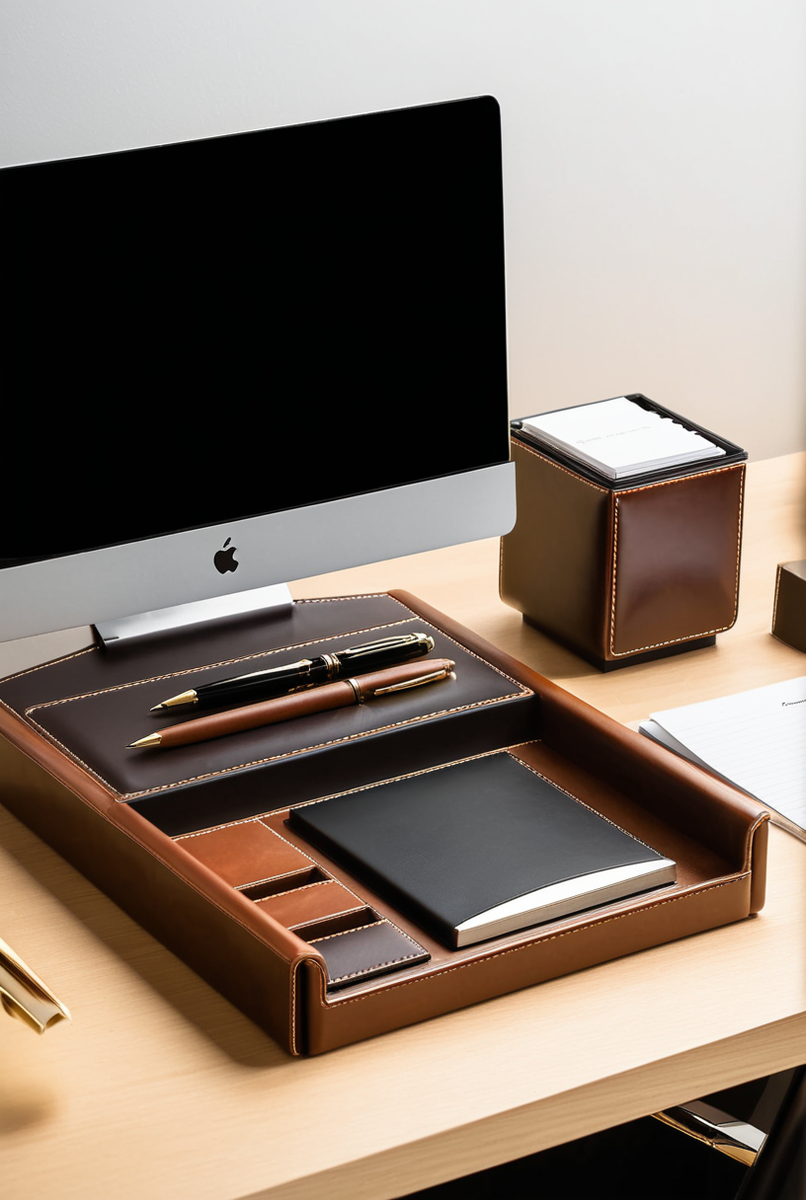 - Материалы и дизайн: кожаный, деревянный или металлический настольный органайзер как ключевые аксессуары для стола