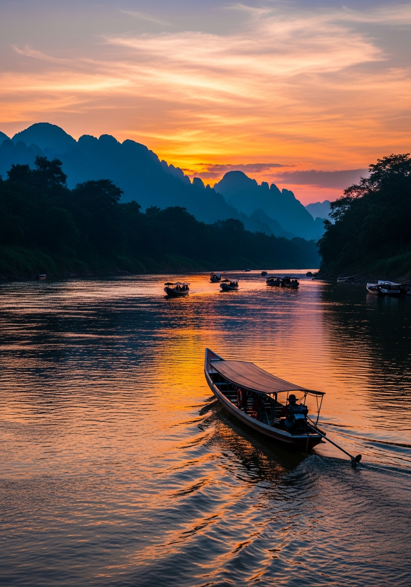 Набережная Меконга — это сердце вечерней жизни Луангпрабанга, где можно наблюдать закаты над великой рекой, сидя в уютном кафе или на лавочке под тропическими деревьями. Это место, где ритм города замедляется, а путешественники находят долгожданный покой.