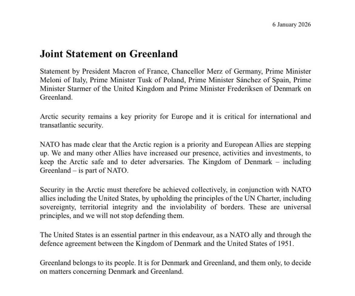 Президент Франции Эммануэль Макрон, канцлер Германии Фридрих Мерц, премьер-министр Италии Джорджа Мелони, премьер-министр Польши Дональд Туска, премьер-министр Испании Педро Санчес, премьер-министр Великобритании Кир Стармер и премьер-министр Дании Метте Фредериксен выступили против территориальных претензий США на Гренландию. В заявлении подчеркивается, что арктическая безопасность остается ключевым приоритетом для Европы и критическим для международной и трансатлантической безопасности. НАТО четко дал понять, что арктический регион является приоритетным, и европейские союзники наращивают свои усилия в этом регионе. Мы и многие другие союзники увеличили свое присутствие, активность и инвестиции, чтобы обеспечить безопасность Арктики и сдерживать противников. Королевство Дания — включая Гренландию — это часть НАТО. Безопасность в Арктике должна достигаться коллективно, в сотрудничестве с союзниками НАТО, включая США, путем соблюдения принципов Устава ООН, включая суверенитет, террито