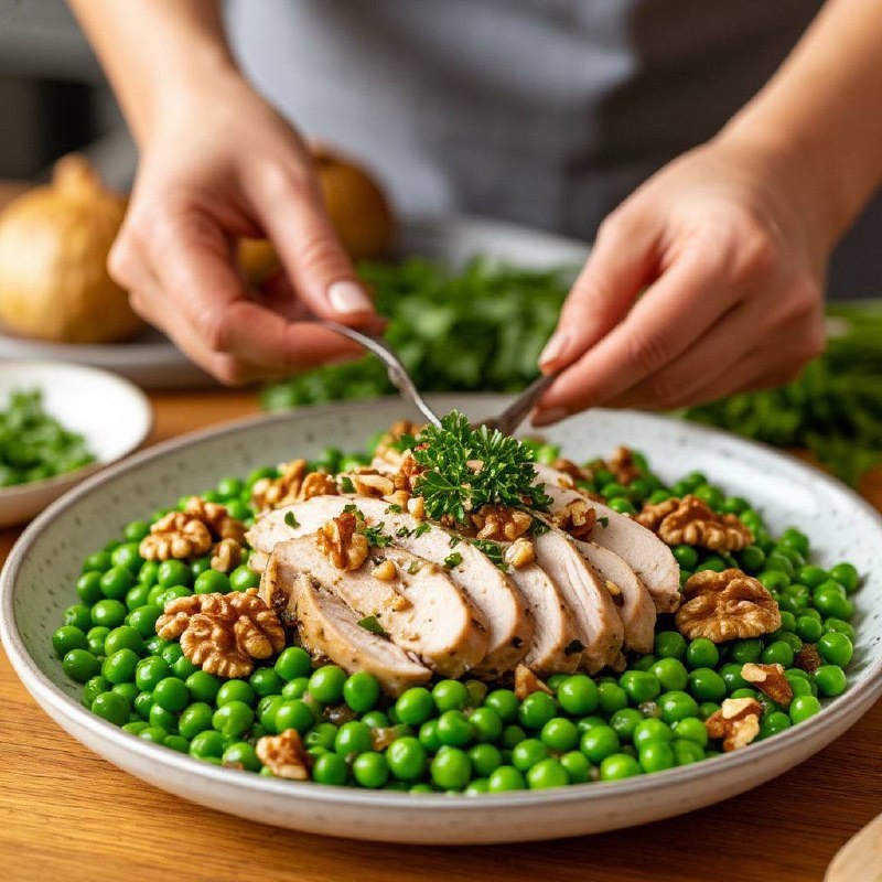 : Рождественский салат с индейкой: ингредиенты: - 300 г индейки (филе) - 200 г моркови - 100 г консервированного горошка - 50 г зеленого горошка (свежего или замороженного) - 70 г грецких орехов - 80 мл оливкового масла - 2 зубчика чеснока - соль и перец по вкусу Приготовление: 1. Нарежьте индейку на тонкие полоски и обжарьте их на сковороде до золотистой корочки. 2. Очистите морковь и нарежьте ее тонкой соломкой. 3. Добавьте горошек к индейке и моркови и перемешайте все ингредиенты. 4. Измельчите грецкие орехи и добавьте их в салат. 5. Приготовьте заправку: смешайте оливковое масло, чеснок, соль и перец. 6. Полейте салат заправкой и перемешайте. 7. Подавайте салат на стол и наслаждайтесь его вкусом! Приятного аппетита!