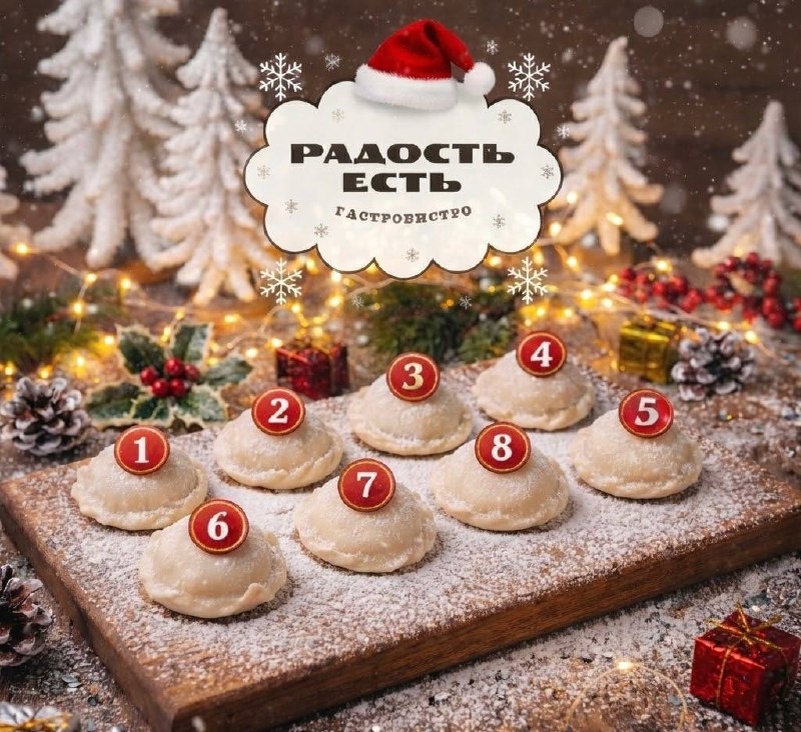 ? 😉 🥟 Особенно вкусно гадать на варениках и пельмешках с сюрпризом! В начинку прятали самые разные предметы от лаврового листа до монетки. С капустой к деньгам, нитка к дальней дороге, пуговица к обновке, вишня к искушению. В гастробистро «Радость есть» сюрпризов в начинке нет, зато их покупка гарантированно предсказывает отличное настроение! 😄 Выбирайте номер пельмешка от 1 до 8 и ловите в комментариях свое предсказание на 2026 год 🔮🎉 Гастробистро «Радость есть», ул. Голубая 1Б