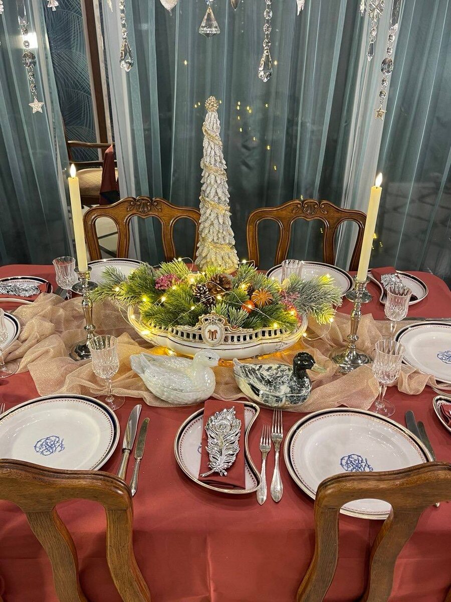 «Вечер гаснет морозный и мирный, Все темнее хрусталь синевы. Скоро с ладаном, златом и смирной Выйдут встретить Младенца волхвы. Обойдут задремавшую землю С тихим пением три короля, И, напеву священному внемля, Кровь и ужас забудет земля. И в окопах усталые люди На мгновенье поверят мечте О нетленном и благостном чуде, О сошедшем на землю Христе. Может быть, замолчит канонада В эту ночь и притихнет война. Словно в кущах Господнего сада Очарует сердца тишина. Ясным миром, нетленной любовью Над смятенной повеет землей, И поля, окропленные кровью, Легкий снег запушит белизной!» Георгий Иванов (1914-1915г) В самом центре стола стоят два уточки, черная и белая. Эти тромплеи- обманки называются «масленица уткой». Изготовлены они на разных фабриках: черная на фабрике М.С. Кузнецова, а белая - на фабрике в местечке Городница. Утка на столе символизирует семейное счастье и верность. Олицетворяют путь — как физический, так и духовный — напоминая о необходимости адаптироваться к переменам и наход