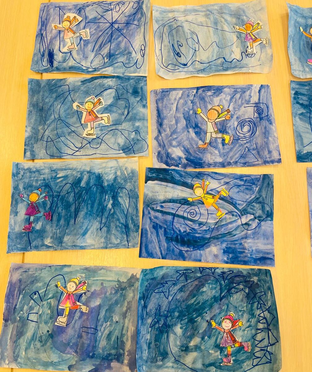 Этим рисунком мы начинали в 2025 году первое занятие в старшей группе ⚪️Обсуждаем новогодние каникулы ⚪️Рисуем акварелью лёд катка ⚪️Раскрашиваем, вырезаем и приклеиваем фигуристов ⚪️А теперь самое интересное - синим фломастером рисуем след от коньков У детей получаются разные следы: ажурные узоры, прямые или ломаные линии и просто хаос☺️ Это здорово, что мы все разные. А мамы среди нескольких работ узнают работу своего ребёнка ❤️Предложите ребёнку сделать такой рисунок и посмотрите, какие узоры вырисовывают ЕГО коньки Вы НЕ удивитесь🤩 #ЧудоЗима