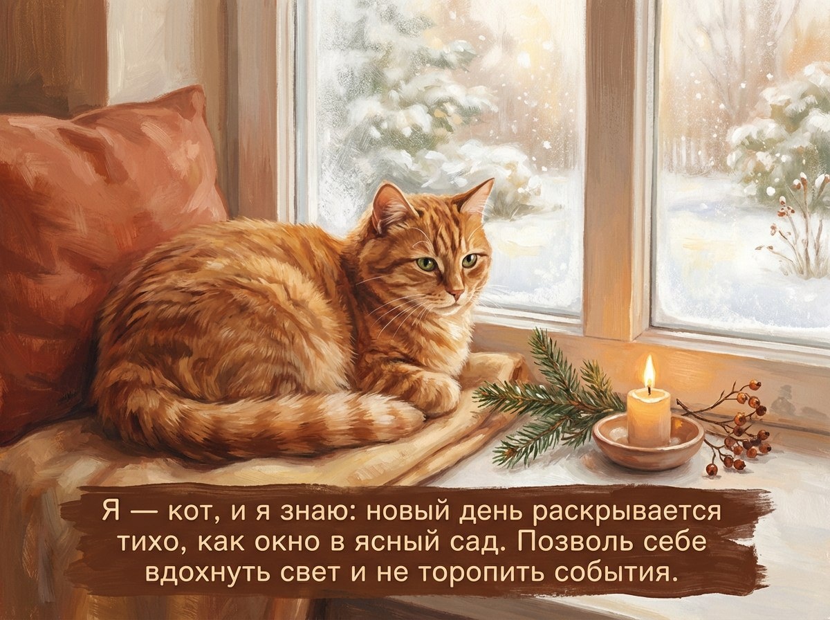 Я — кот, и я знаю: новый день раскрывается тихо, как окно в ясный сад. Позволь себе вдохнуть свет и не торопить события — у каждого шага есть свой правильный ритм, а у каждого чувства — право быть услышанным. Сегодня 7 января, Рождество: день, когда в мире становится больше тепла и смысла. Пусть и в тебе родится мягкая вера — в добрые перемены, в поддержку рядом, в собственную способность выбирать свет. Иди бережно: делай одно важное дело за раз, благодарно замечай хорошее, не спорь с собой. Я рядом своим спокойствием и вниманием: ты справишься, и этот день принесёт тебе тихую радость.