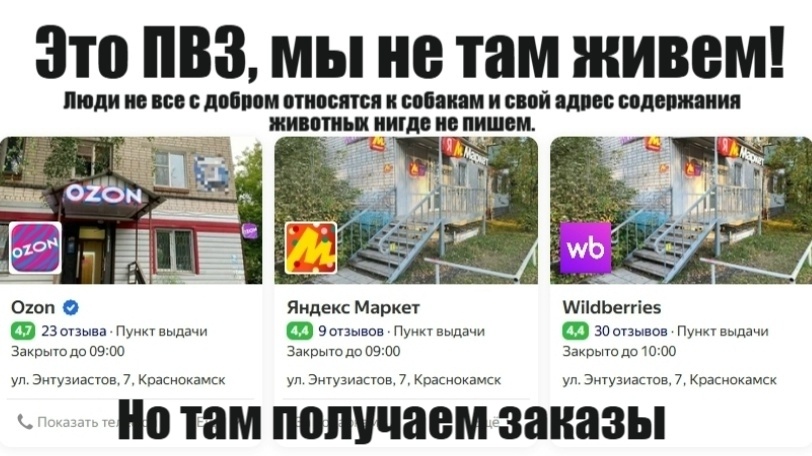 Дорогие друзья, адрес который мы указываем в наших постах для отправления помощи и подарков собакам - это адрес ПВЗ (пункты выдачи заказов)! А не наш фактический адрес проживания. Свой адрес содержания животных мы в открытом доступе нигде не пишем потому что не все люди могут придти с добром! И наш адрес знает только тот кто приезжал в гости к собакам. Этот адрес удобен потому что там находятся пункты основных маркетплейсов которыми пользуемся и удобно получать заказы в одном месте. Вчера у нас вышло не большое недоразумение.