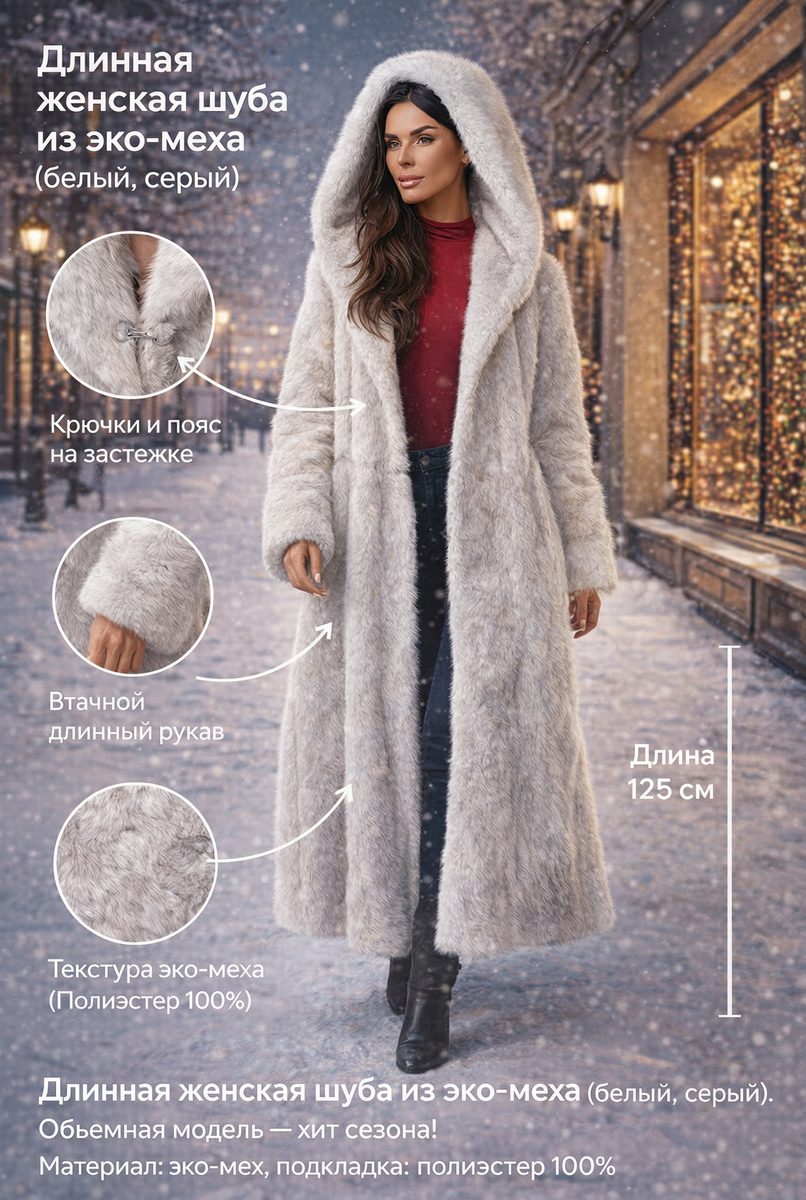 Зима 2026 года проходит под знаком нежности, объемов и осознанной моды. Самый яркий тренд сезона — шубы из эко-меха в цвете «Cloud Dancer». Этот оттенок — мягкий молочно-белый с легким холодным подтоном светло-серого льда — покорил подиумы, стрит-стайл и сердца тысяч девушек. Объемные модели в этом цвете стали абсолютным must-have: они выглядят роскошно, дарят ощущение уюта и идеально вписываются в концепцию экологичной моды. Давайте разберемся, почему именно шубы из эко-меха «Cloud Dancer» заслуживают места в вашем гардеробе. Молочно-белый с серым подтоном — это не просто красивый оттенок, это универсальный нейтрал, который освежает любой образ. В отличие от чистого белого, он не такой маркий и выглядит благороднее. Дизайнеры называют «Cloud Dancer» «новым черным» зимнего гардероба: он сочетается с пастелью, глубокими цветами и даже неоном. Объемные силуэты добавляют шубе воздушности и женственности. Прямой крой длиной 125 см надежно защищает от ветра и мороза, а капюшон и пояс позвол