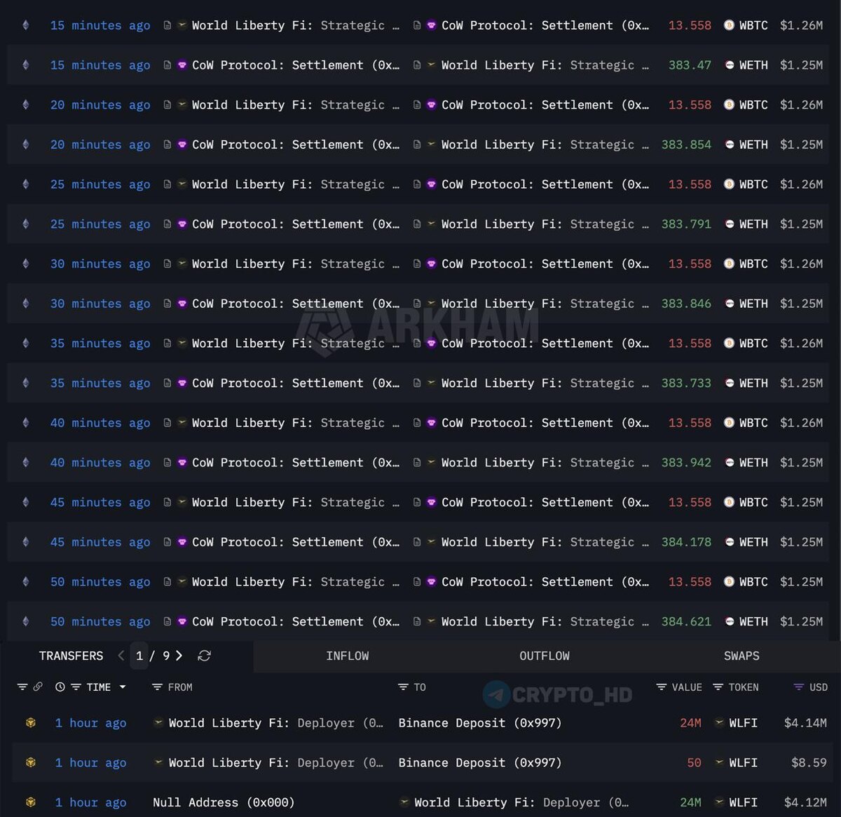 🤔 World Liberty Financial меняет BTC на ETH. Компания вывела аз Aave 162,59 WBTC ($15,07m) и продала их за 4611,65 WETH ($15,03m), зафиксировав убыток по WBTC $1,97m. Кроме того, организация перевела на Binance 24m WLFI ($4,14m). Ранее: партнерство с MMA Group Crypto Headlines