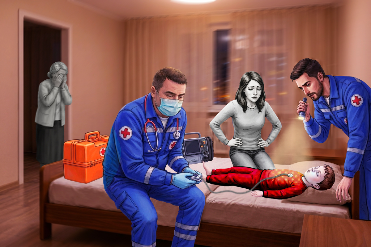 – Алло, скорая помощь? – голос её срывался. – Быстрее приезжайте! Ребёнок, три года четыре месяца... Не знаю, что с ним! Температура 37,8, хромал на ногу, потом жаловался на живот, а теперь закрывает глаза и почти не отвечает. Помогите! Что? А, сейчас... Наш адрес...