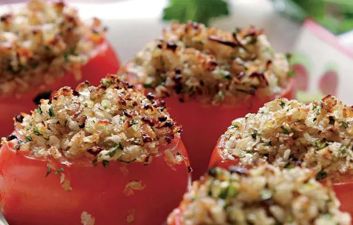 Ингредиенты: - 8 средних крепких помидоров - 4 средние луковицы - 3 ломтя черствого белого хлеба - небольшой пучок петрушки - растительное масло - соль - черный перец Приготовление: Черствый хлеб натрите на терке или нарежьте кусками и измельчите в блендере в мелкую крошку. У петрушки удалите стебли (они здесь не понадобятся). Листья петрушки мелко нарежьте. Лук очистите, мелко нарежьте. В сковороде разогрейте растительное масло, положите лук и обжарьте на среднем огне, помешивая, до золотистого цвета, 10 минут. Добавьте к луку петрушку, посолите и поперчите. Отрежьте у каждого помидора верхнюю треть - “крышечку”. При помощи острой ложки удалите семена вместе с жидкостью, добавьте в сковороду с хлебом и прогрейте. Наполните помидоры хлебной начинкой. Выложите в кастрюлю с толстым дном, сбрызните маслом и поставьте на средний огонь. Немного обжарьте под крышкой, 5-7 минут.