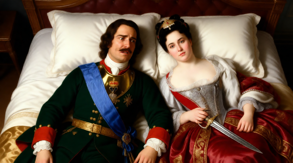 Петербург, 1721 год. Глубокая ночь в Летнем дворце. За окнами штормит Нева, а в спальне Петра I и Екатерины царит тревожная тишина. Государь, вернувшийся с верфей, пытается уснуть, но рядом Марта Скавронская, будущая императрица, ворочается в постели. Неожиданно она вскрикивает на непонятном языке, сжимая в руке нож, который всегда лежал под подушкой. Петр открывает глаза — её взгляд устремлён в темноту, но зрачки неподвижны, будто она видит то, чего не видит он. «Ты спишь, но не отдыхаешь. Какие демоны мучают твою душу?» — шепчет он, не получая ответа. За этим спокойным вопросом скрывается страх правителя перед тайной жены, чьи ночные привычки напоминали ему о хрупкости человеческого разума.