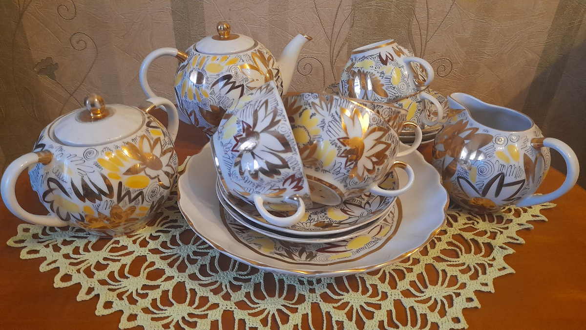 Я уже, по-моему, не раз писала, что моё собирательство винтажного советского фарфора началось с желания собрать родительский сервиз "Золотые ромашки" ЛФЗ. Этот сервиз родителям подарили в 1972 году на их серебряную свадьбу. И это была первая такая приличная посуда в нашей семье. До этого никаких сервизов, ни чайных, ни столовых не водилось. Да, и вообще, в то время в нашем городе (а тогда это был Свердловск) такого фарфора в свободной продаже, мне кажется, не было. А что касается "Золотых ромашек", где-то прочитала, что в 70-е годы именно этот сервиз был выпущен массовым тиражом. Форма - "тюльпан", автор формы С.Е. Яковлева. По-моему, в те годы это была любимая форма ЛФЗ. Автор рисунка - Л.И. Григорьева. Рисунок, как деколь, так и ручная роспись, причём по преимуществу золотом. Наверно, в том числе и поэтому он был тогда так популярен. Подаренный сервиз включал: 6 чайных пар, чайник, сахарницу, сливочник и сухарницу. И мы им активно пользовались. Да, в основном по праздникам, но то