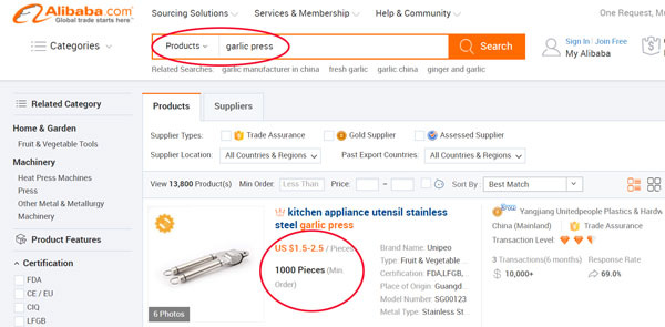 Просто введите то, что вы ищете, в строке поиска, и Alibaba выдаст список поставщиков, цены и минимальное количество заказа.