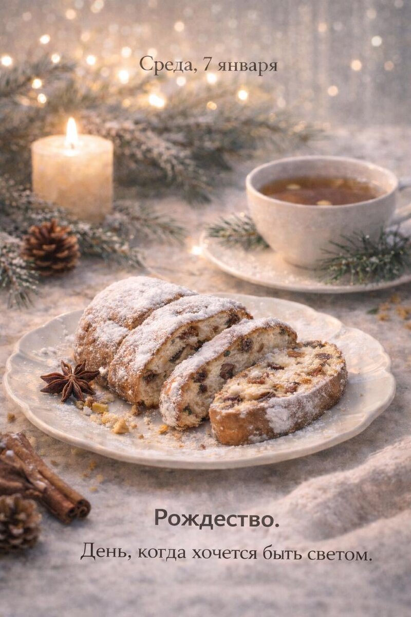 Сегодня — не просто среда. Сегодня Рождество. День, когда хочется быть светом. ✨Зачем телу сегодня: После плотной еды, суеты и эмоциональных качелей телу нужна опора — мягкая, сладкая, настоящая. Пищеварение уже устало. Душа — тоже. Но ты можешь быть для себя тем, кто не требует, а утешает. ☀Три действия на сегодня: 1. Тонкий ломтик рождественского штоллена — с тёплым пряным чаем (без кофеина). Запах специй и сухофруктов поднимает в теле мягкое тепло. 2. 5 минут в уединении: закрой глаза и вспомни, кого ты хочешь поблагодарить — пусть даже мысленно. 3. Намажь ладони и грудную клетку каплей масла (кунжутного или гхи) — и просто посиди, вдыхая. ❗Кому осторожно: Штоллен — сытный. Лучше в первую половину дня, после основного приёма пищи. Беременным, кормящим и при слабом ЖКТ — понемногу, в спокойствии. Образ дня: Ломтик штоллена на белом блюде, золотистая крошка на пальцах, тёплый взгляд в окно, где тихо идёт снег. Сегодня — день, когда ты можешь выбрать нежность. Сохрани, чтобы устр