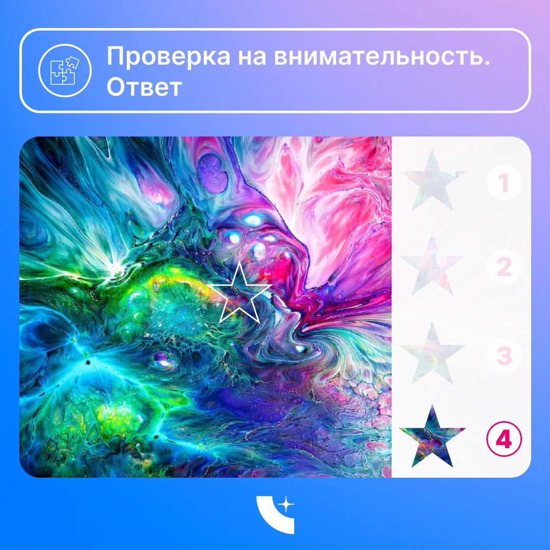 Если вы выбрали 4 вариант — поздравляем, это верный ответ 👏 Согласимся, что остальные варианты выглядели похоже, но при внимательном сравнении можно заметить, что они не подходят под общую картинку 👀 Такие задания отлично показывают, как мозг любит додумывать изображение целиком и иногда спешит с выводами. Небольшая пауза и внимательный взгляд — и правильный ответ находится гораздо быстрее. Спасибо всем, кто участвовал! Хотите ещё одну проверку на внимательность? 😉 👉 Вы можете записаться на диагностику и лазерную коррекцию зрения в любую клинику, на удобную вам дату по бесплатному телефону горячей линии: 88001009876. Чтобы получить скидку и записаться по акции, перейдите на пост со специальным промокодом: https://dzen.ru/media/korrektsiya/-tolko-dlia-podpischikov-nashego-telegram-kanala-korrektsiyazreniya-68db6685ccdb6454066e916e. 18+. Имеются противопоказания, необходима консультация специалиста. ⭐️ Глазные операции, доступные каждому!