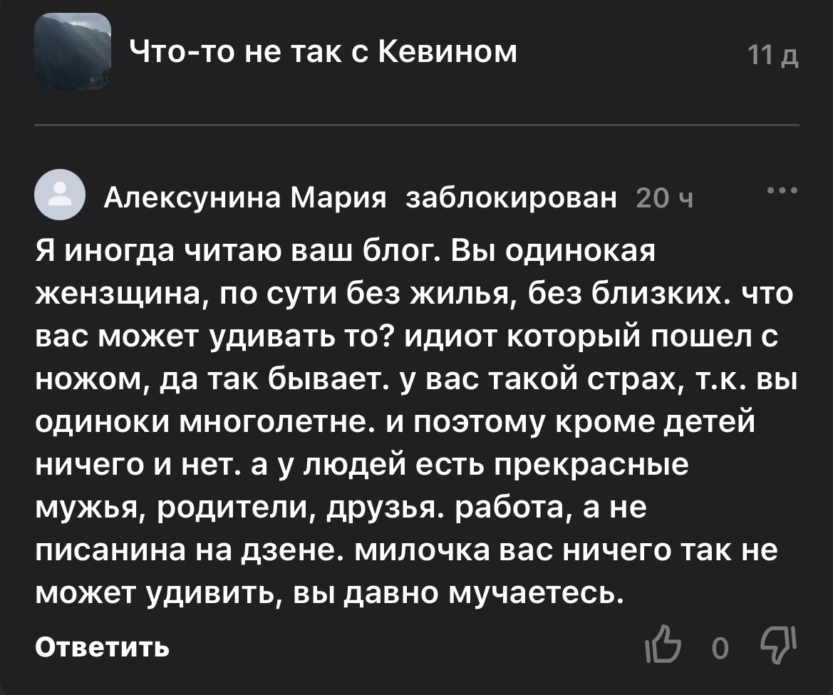 Я как диванный психолог могу предположить, что Марию та статья сильно триггернула, потому что она тоже боится за своих детей. В таких случаях человек обычно хочет получить иллюзию контроля. Так, она боится, потому что у нее нет жилья, близких, мужа, родителей и друзей, а также работы (промолчим о том, что из всего списка у меня нет только мужа славатехоспади и собственного жилья эка невидаль). А у меня, Марии, все это есть, поэтому со мной точно всё будет хорошо. Фух, выдыхаю, но только сначала напишу человеку, насколько он никчемный в моих глазах. Чтобы картинка точно сложилась в голове, её нужно вынуть из себя и написать буковками, чтобы другие прочитали. Тогда заклинание точно сработает.