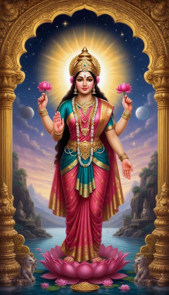 Я — Лакшми, богиня изобилия, процветания и благодати, восседающая на цветущем лотосе, окружённая слонами, изливающими на меня потоки чистой воды. Я обращаюсь к тебе, чтобы открыть врата к изобилию, которое уже ждёт тебя в потоке жизни.