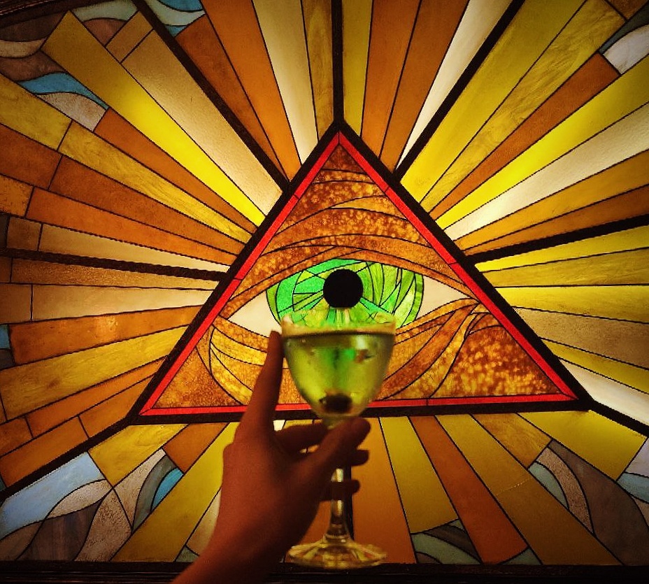 Когда я попросила что-то травянисто-дурманящее, мне принесли коктейль "маска иллюминатов" - коктейль с водкой и мелиссой. Сверху у коктейля бархатная пенка с рисунком.