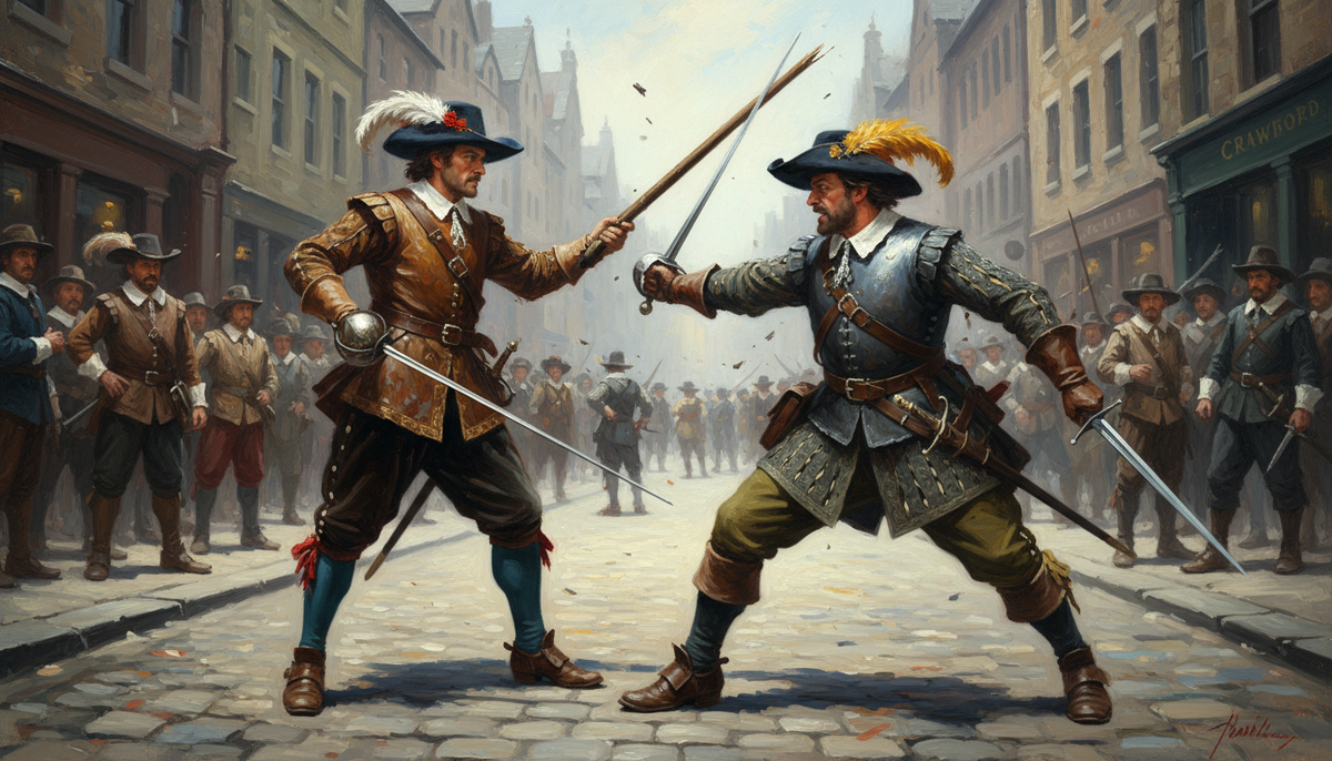Посреди оживлённой эдинбургской улицы капитан Кроуфорд выхватил палаш. Напротив него стоял майор Джеймс Сомервилль, комендант королевского замка — с деревянным посохом в руках. Меч висел на спине. Времени достать его не было. Шотландия 1640 года напоминала пороховую бочку. Король Карл I пытался навязать англиканскую церковь пресвитерианам-шотландцам. Страна раскололась. «Ковенантеры» — защитники старой веры — против «кавалеров», верных королю. Сомервилль принадлежал к первым. Кроуфорд — ко вторым. Конфликт начался с оскорблений. Кроуфорд назвал лорда «якобитским развратником» и «негодяем в сапогах». Сомервилль ответил, что капитан — «гнусный безумец, годный для Бедлама». Бедлам — это психиатрическая лечебница в Лондоне. Худшее место, которое можно было представить. Кроуфорд выбрал локацию неслучайно. Одна из самых людных улиц столицы. Отступать лорду было некуда — ни физически, ни в плане чести. Капитан атаковал первым. Палаш и кинжал против деревянной трости — неравный бой. Сомервилл
