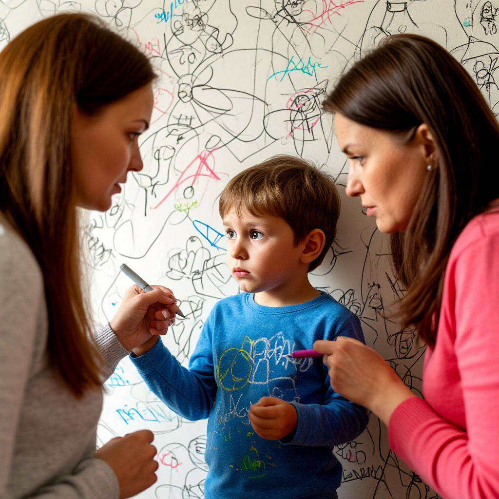 В воскресенье утром Марина проснулась от детского плача. Выбежала в гостиную — Миша сидел на полу и ревел, а рядом валялись фломастеры. На светлых обоях, которые она клеила полгода назад, красовались яркие каракули — зигзаги, кружочки, какие-то чёрточки. Метр в высоту и два в длину.