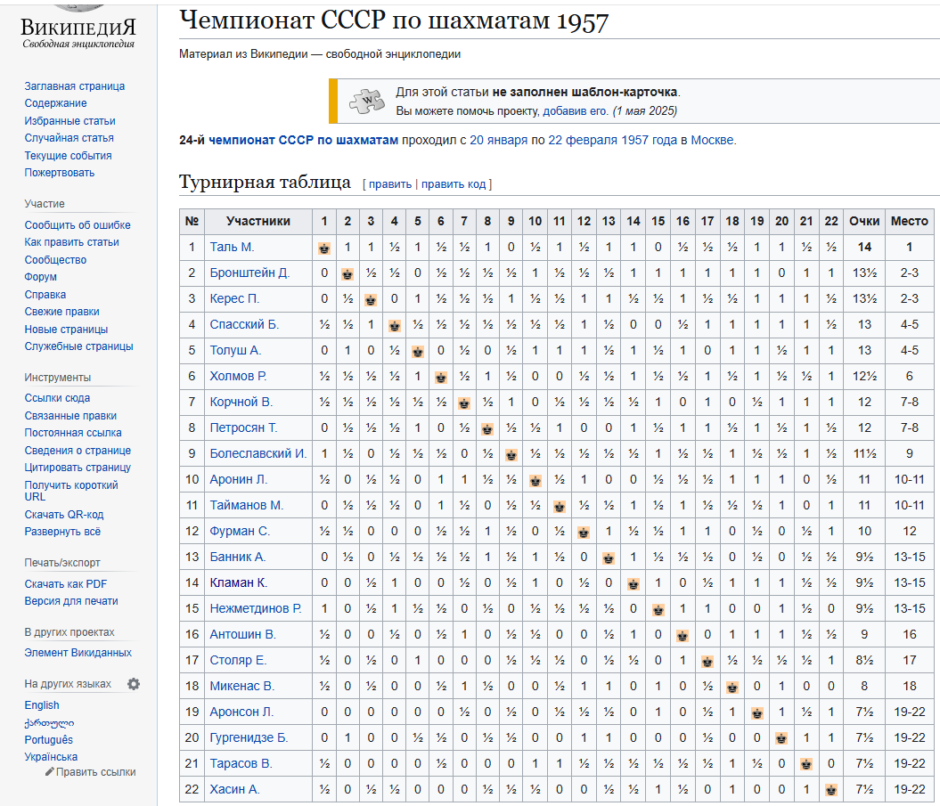 Шахматный Чемпионат СССР 1957 года был невероятно сильный. Участвовали звезды: Таль, Бронштейн, Спасский, Корчной. Петросян... Почти месяц играли круговой турнир в 21 тур. Из 232 партий было всего 107 ничьих, вот это МЯСОРУБКА была... Может быть в этом причина "наших" неуспехов последние годы? Но сейчас не об этом... Будущий Чемпион мира и Чемпион этого турнира Михаил Таль, не придумал ничего лучшего, и стал слоном "b7" ходить в угол и обратно. Пока Таль гулял слоном, Нежметдинов сделал профилактику, увел Короля в безопасное место, и перевел белопольного слона на "b3" -усилил позицию. Возможно Черные хотели Белых спровоцировать на ошибку, хотя Нежметдинова разогревать было не нужно, он всегда заряжен в желании поставить мат. Первым дернулся Таль, его центральные пешки ошибочно пошли вперед. Вскрытие Центра оказалось к выгод Белых. Ход 29...е2?? оказался решающей ошибкой, и будущий чемпион мира получает мат! Невероятный разгром будущего Чемпиона.