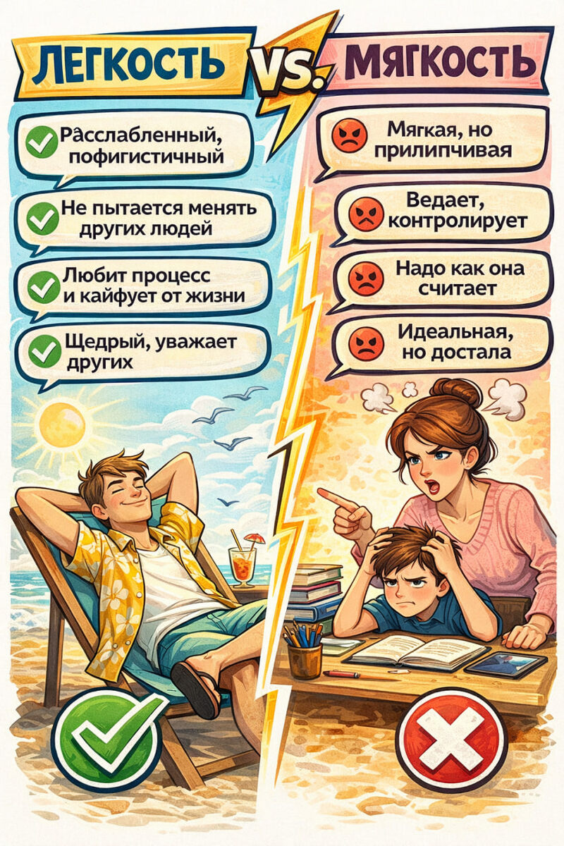 На картинке — проявления мягкой и тяжелой мамы. Но может быть мягкий и легкий человек!