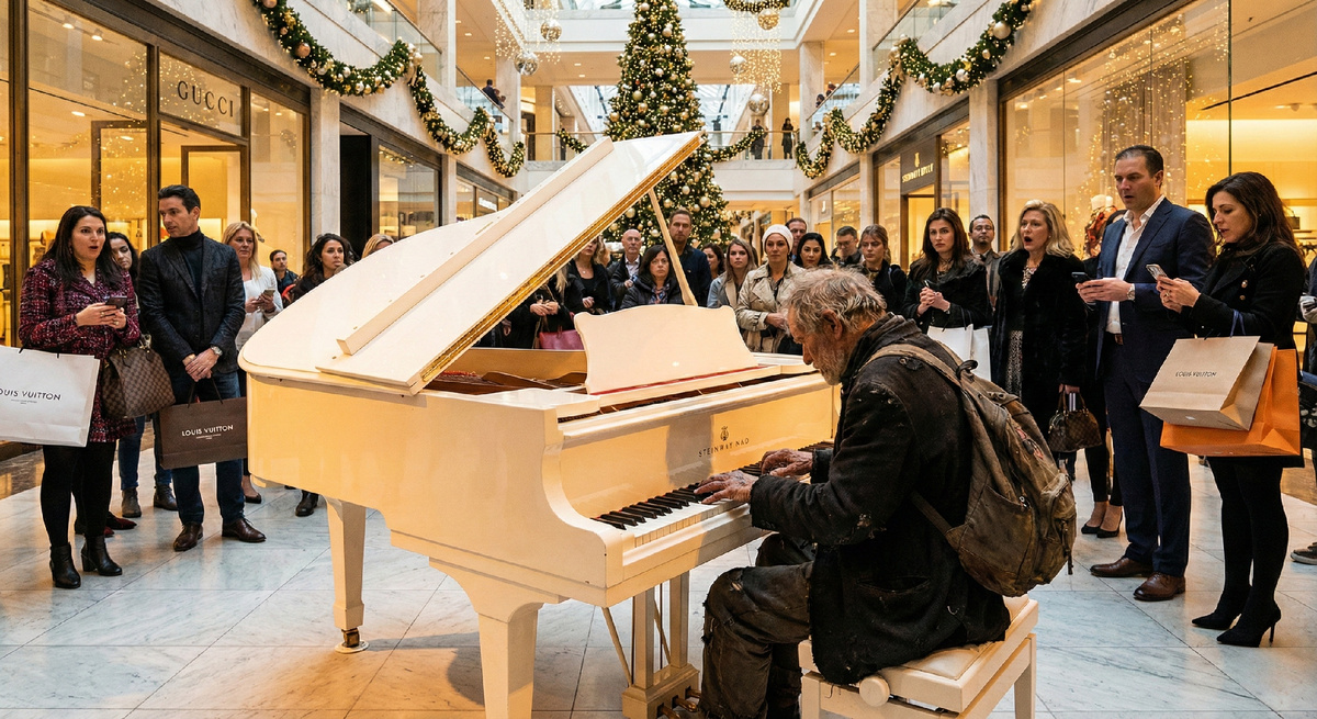 Подпись: «Бомж сыграл на рояле так, что весь ТЦ плакал. А охрана выкинула его на мороз».