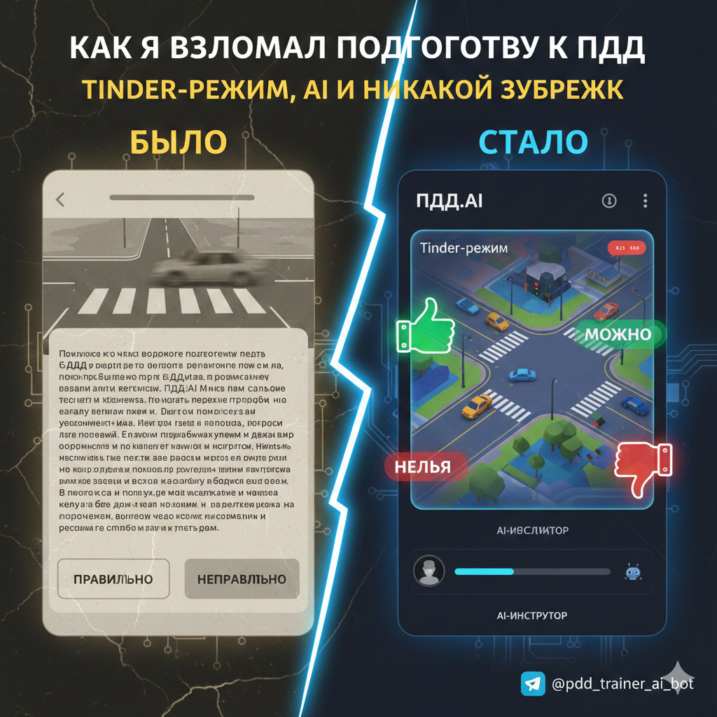 Неудобные кнопки, реклама через каждое действие, приложения весят по 100+ МБ, а телефон греется, как печка. Но самое страшное даже не это. Главная проблема — метод обучения. Большинство сервисов предлагают тупое заучивание: «Прочитал вопрос — ткнул ответ». Никакого понимания логики, никакого разбора ошибок. Вы просто дрессируете себя, как собачку Павлова. На реальной дороге это не спасет. В какой-то момент мне стало проще написать своё решение, чем терпеть это. Так появился ПДД.AI. Я проанализировал десятки популярных "решалок" и выделил главные боли курсантов: Я решил пойти от обратного. Убрал всё лишнее и добавил технологии 2026 года. Больше не нужно качать тяжелые приложения — всё работает прямо в Telegram (Mini App). Летает даже на старых телефонах. Вот что получилось собрать внутри: 1. База, без которой н