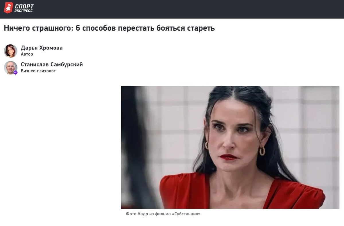 Страх старения — это далеко не про внешность и не про цифру в паспорте. Это скорее про потерю контроля, статуса и идентичности, в которую вы встроились. Психолог Самбурский рассказал про психологию принятия возраста: https://m.sport-express.ru/zozh/health/reviews/pochemu-strashno-staret-i-kak-perestat-boyatsya-starosti-rasskazyvaet-psiholog-2387083/