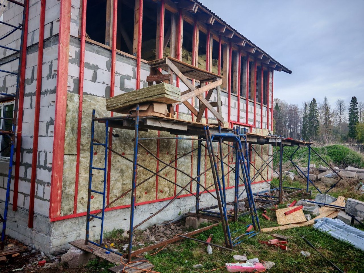 Всем доброго времени суток! Пытаюсь достроить дом после горе строителей, которые не сделали армопояс и (крыша сложилась зимой) и вместо дома из газобетона на выходе получился какой-то комбинированный дом, где первый этаж из газика, а второй наполовину из газика, наполовину каркасник. Сам я строитель, но совсем в другой сфере, строительством домов никогда не занимался, поэтому нуждаюсь в совете. Есть ощущение, что сильно накосячил с внешней обшивкой, а точнее, с утеплением. Было так: Я снял размокшие листы ОСБ, установил обрешетку и начал утеплять. Утеплять стену, которой нет, что я осознал относительно недавно. Вот теперь ломаю голову, что делать. Нужно было, по идее прикрутить сначала новые листы ОСБ, а уже потом утеплять поверх, но сейчас дом находится в таком виде. Вот теперь думаю, как исправлять ситуацию, можно ли теперь изнутри между стойками поставить листы ОСБ или придется все разбирать или они там вообще не нужны. Опыта в строительстве домов ноль, но как-то уже закончить эту э