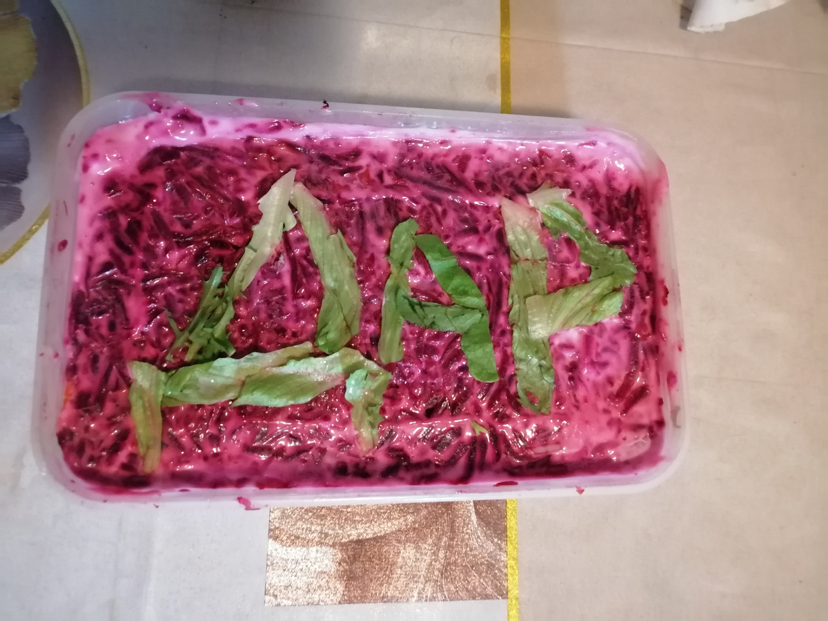Каждые новогодние рождественские каникулы я делаю селедку под шубой и пишу на ней какое-то послание. Начиналось все с цифр нового года, потом я однажды написала "From Vera with love." В 2023 ревела и вырезала из овощей "Мир и любовь" - потом было "Всем здоровья!"
