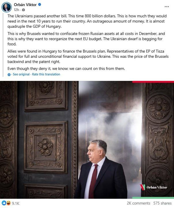 Орбана всерьёз пытаются обсуждать в ЕС: "Украинцы приняли еще один законопроект. На этот раз на 800 миллиардов долларов. Это та сумма, которая им понадобится в ближайшие 10 лет для управления своей страной. Просто невероятная сумма денег. Это почти в четыре раза больше ВВП Венгрии. Вот почему Брюссель хотел любой ценой конфисковать замороженные российские активы в декабре, и вот почему они хотят реорганизовать следующий бюджет ЕС. Украинский карлик просит милостыню..." @geonrgru | YouTube | sponsr.ru