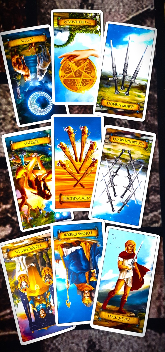 Перевернутые Восьмерка Мечей и Колесница говорят о постепенном снятии барьеров. Он чувствует, что внутренние и внешние препятствия теряют силу - он больше не скован прежними ограничениями. Однако перевернутый Король Кубков указывает на нестабильность его эмоциональных импульсов, его чувства или намерения пока не обрели твердую основу.