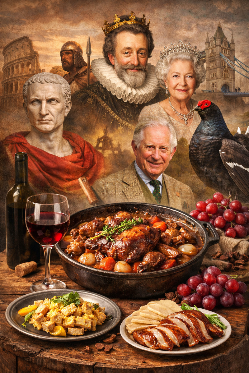 Один из самых ярких примеров — знаменитый Coq au vin, «петух в вине». Блюдо, которое сегодня подают в ресторанах с белыми скатертями, когда-то было едой бедняков, военным посланием и политическим жестом. И, как ни странно, в этой истории есть всё: Юлий Цезарь, публичная казнь, коронационные банкеты и даже британский король Карл III. 53 год до н. э. Юлий Цезарь ведёт одну из самых жестоких своих кампаний — войну против галльских племён. Галлы отчаянно сопротивляются и удерживают крепость Алезию в Бургундии. Их вождь, Верцингеторикс, отправляет Цезарю символический «подарок» — петуха.
