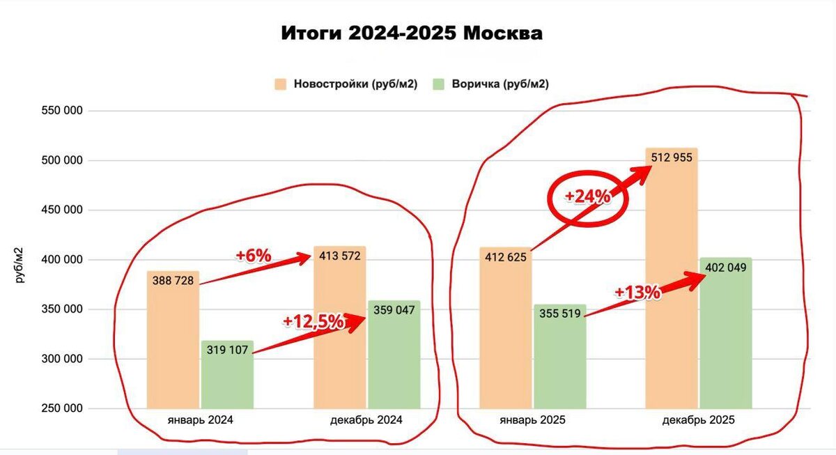Часто слышу мнение: «Сейчас покупать не стоит — всё слишком дорого. Вот если бы цены откатились хотя бы на год назад…» Понимаю логику, но предлагаю смотреть на цифры, а не на ощущения. Стратегию строим на данных. 📈 Рост цен на новостройки По данным «Домклик», в 2025 году новостройки в Москве показали +24% годового роста. Да, это много. Но это лишь часть картины. 💰 Рост зарплат Средняя зарплата в Москве за два года выросла на 30%: в 2024-м — на 17%, в 2025-м — ещё на 13%. 🏗 Сравниваем динамику За те же два года цены на новостройки выросли ровно на 30% — то есть идут вровень с доходами. Вторичка прибавила 25,5% — немного отстаёт из-за высоких ипотечных ставок. Но ключевая ставка уже снижается, и этот разрыв, скорее всего, будет закрыт. Что дальше? Смотрим на утверждённый бюджет Москвы: ▪️ 2026 год — рост зарплат +14,5% ▪️ 2027 год — ещё +8% Если рынок продолжит следовать за доходами (а исторически он это делает), средние цены на недвижимость за два года могут вырасти ещё на 22–23%