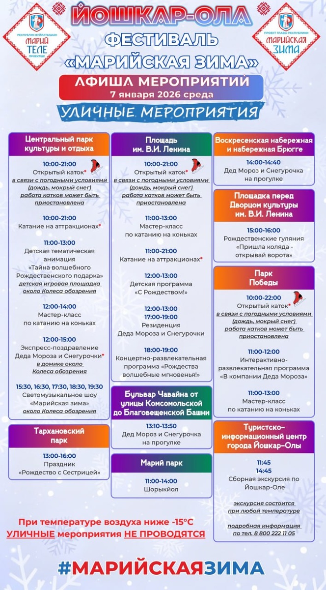 » В афише уличного фестиваля можно найти развлечения на любой вкус и возраст. Активности проходят как на уличных площадках – на набережных, площадях и в парках города – так и в музеях, Дворцах культуры и театрах Йошкар-Олы. Посетителей ждут катания на коньках, светомузыкальное шоу, прогулки со сказочными персонажами, а также выставки, новогодние представления, мастер-классы. Фестиваль «Марийская зима» реализуется по инициативе Главы Марий Эл Юрия Зайцева и проходит уже в четвертый раз.