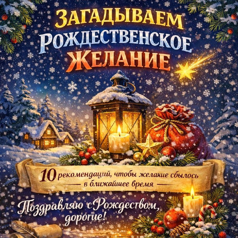 10 рекомендаций, чтобы желание сбылось в ближайшее время Рождественские желания обладают мощной энергией, а соблюдая простые рекомендации можно сделать так, чтобы заветная мечта сбылась) 1️⃣ Не всегда хорошо то, что выгодно Первое и главное правило - забыть обо всем материальном. Понимаем, что порой очень хочется новый телефон или красивое драгоценное колечко, но обычно эти желания высшие силы исполняют в последнюю очередь. Рождество - праздник душевный, поэтому и загадывать стоит нечто большее, например, здоровье, силы, любовь или места, в которых хочется побывать. Таким образом вы сможете исполнить и маленькие желания, ведь благополучие обязательно даст силы на великие свершения. 2️⃣Благодарность — благодетель Перед тем, как загадать желание, стоит поблагодарить жизнь за то, что уже имеете. Скажите искренне «спасибо» за все: здоровье, семью, друзей, работу, впечатления и приключения. Издавна благодарность считается гарантом исполнения мечт - проверено на практике. 3️⃣Снег - тоже